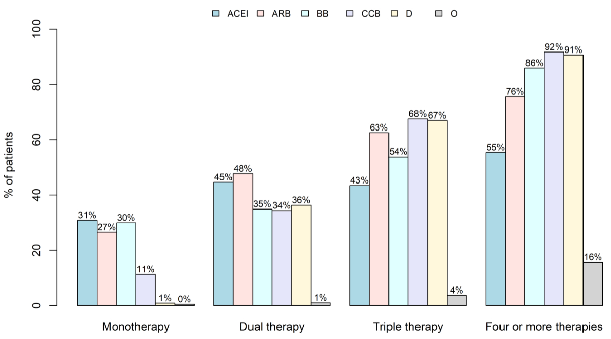 Figure 2Drug classes by intensity of prescribed pharmacotherapy. Percentages are stratified across patients receiving monotherapy, dual therapy, triple therapy, and four or more therapies. ACEI: angiotensin-converting enzyme inhibitor; ARB: angiotensin receptor blocker; BB: beta-blocking agent; CCB: calcium channel blocker; D: diuretic; O: other antihypertensives.