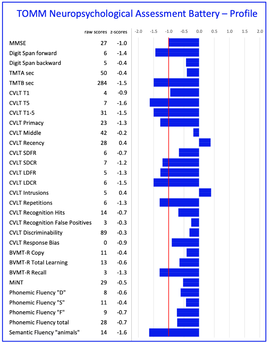 Figure 3Current paper-pencil-based neuropsychological assessment profile. Example of a comprehensive neuropsychological assessment using the TOMM-Neuropsychological Assessment Battery [45]. Normative data are based on 198 cognitively healthy adults. A cognitive profile is shown of a patient with a mild neurocognitive disorder due to Alzheimer’s disease. CVLT-II: California Verbal Learning Test; BVMT-R: Brief Visuospatial Memory Test–Revised; TMT: Trail Making Test; MiNT: Multilingual Naming.