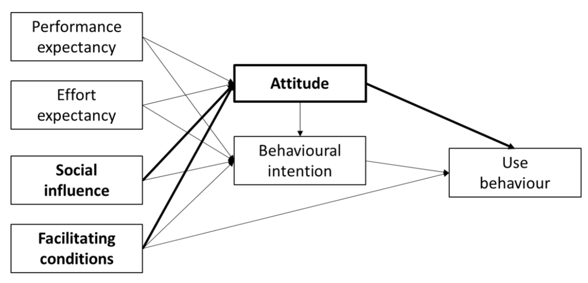 Figure 4Model of technology acceptance: different factors influencing use behaviour; in bold the factors with the most important influence. Adapted from: Dwivedi YK, Rana NP, Jeyaraj A, Clement M, Williams MD. Re-examining the Unified Theory of Acceptance and Use of Technology (UTAUT): Towards a Revised Theoretical Model. Inf Syst Front. 2019;21(3):719–34 [83], https://doi.org/10.1007/s10796-017-9774-y, distributed under the terms of the Creative Commons CC BY license (https://creativecommons.org/share-your-work/cclicenses/).