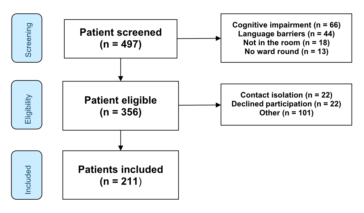 Data collection took place between 25 August and 8 September 2023. Hospitalised patients from 4 teaching hospitals (University Hospital Basel, University Hospital Bern, Cantonal Hospital Aarau, Cantonal Hospital Baselland Liestal) were interviewed by members of the study team. A total of 211 participants were recruited using a convenience sampling strategy, with approximately 50 patients per centre to ensure proportional representation and logistical feasibility. Switzerland’s healthcare system ensures universal health insurance coverage and is known for its high standards of care. Internal medicine wards in Swiss hospitals provide multidisciplinary care for adults with diverse acute and chronic medical conditions, including cardiovascular, respiratory, gastrointestinal and metabolic diseases. Inclusion criteria were at least one completed ward round (either with a resident, attending or consultant physician), sufficient knowledge of the local language, availability for interview and no present cognitive impairment. Ward rounds were conducted by the resident physician either alone or with an attending physician or consultant physician.