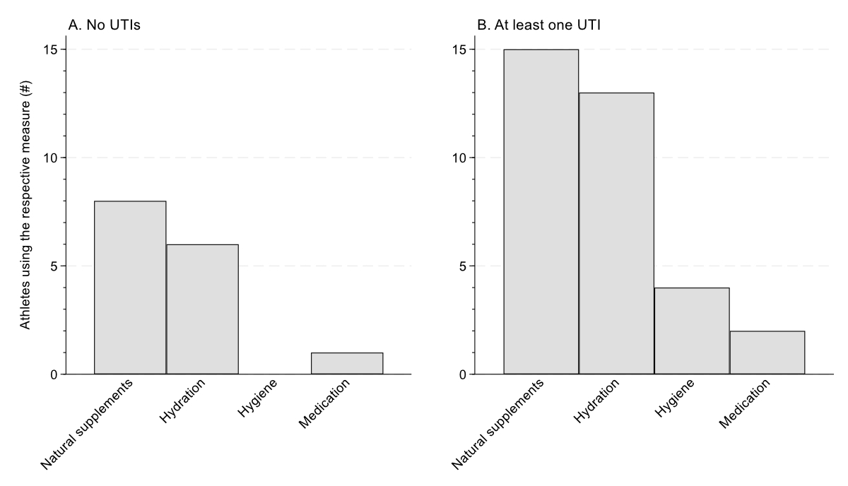 Even the occurrence of a single urinary tract infection is relevant for elite athletes. A seemingly minor decrease in training volume or performance can have huge consequences in elite sports, where the difference between winning and losing competitions can be very small [32]. In non-disabled endurance athletes, a short-term (0–4 weeks) reduction or complete cessation of training leads to decreased cardiorespiratory, muscular, metabolic and hormonal functioning [33]. In elite track and field athletes, every training week that had to be modified due to illness or injury led to a significant decrease in the achievement of performance goals during international competitions [34]. The majority of our athletes who had experienced a urinary tract infection reported a negative impact on training volume and performance. Furthermore, an average loss of four training days was reported. The high number of urinary tract infections, together with the impact on training and performance, highlights the relevance of this problem and the need for effective strategies to reduce the occurrence of urinary tract infections in this population.