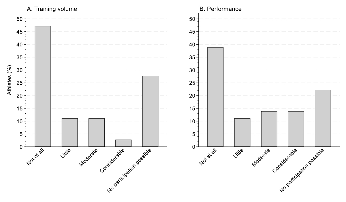 Figure 2Impact of urinary tract infections (UTIs) on (A) training volume and (B) performance among athletes with at least one urinary tract infection. These were multiple-choice questions.