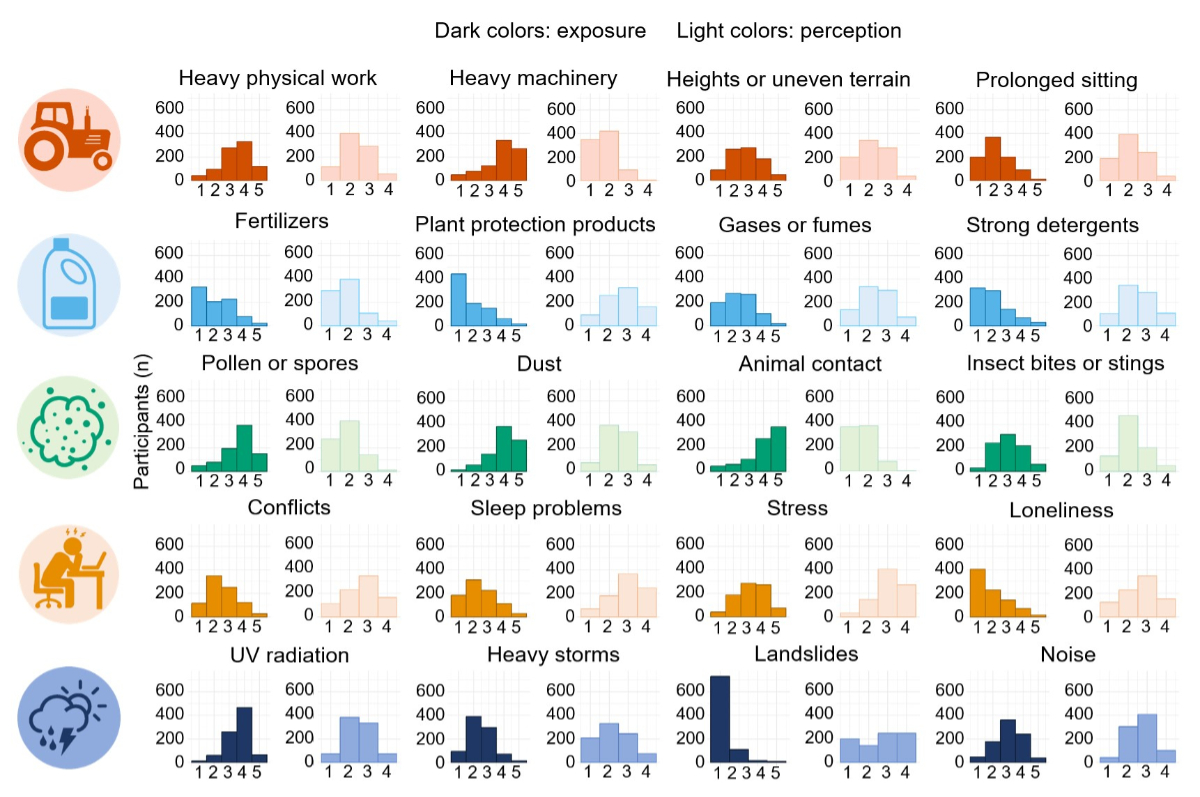 Figure 2Distribution frequency of the 20 pre-selected occupational hazards. The distribution of exposure frequency is presented in dark colours (1 = never exposed, 2 = rarely exposed, 3 = occasionally exposed, 4 = often exposed, 5 = always or almost always exposed). The distribution of perceived health harmfulness is displayed in light colours (1 = not harmful, 2 = somewhat harmful, 3 = rather harmful, 4 = very harmful). Missing values (NA) for each hazard (exposure & perception): heavy physical work: 6 & 11, heavy machinery: 6 & 11, heights or uneven terrain: 6 & 15, prolonged sitting: 7 & 13, fertilizers: 7 & 23, plant protection products: 8 & 31, gases or fumes: 7 & 21, strong detergents: 8 & 23, pollen or spores: 8 & 14, dust: 7 & 12, animal contact: 7 & 15, insect bites or stings: 7 & 14, conflicts: 7 & 13, sleep problems: 7 & 14, stress: 8 & 11, loneliness: 9 & 18, UV radiation: 9 & 13, heavy storms: 9 & 18, landslides: 9 & 33, noise: 10 & 19.