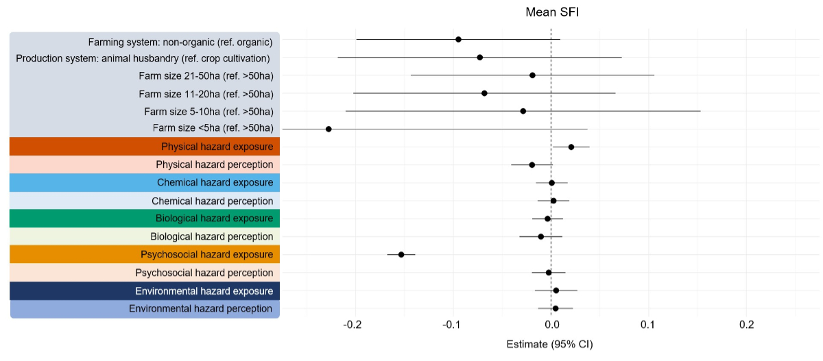 Figure 3Results of the zero-one inflated beta regression model (logit link) depicting the association between farming system (non-organic, organic), production system (crop cultivation, animal husbandry/mixed), farm size in hectares (<5, 5–10, 11–20, 21–50, >50), exposure frequency to hazards (sum; Likert scale: 1 = never exposed, 2 = rarely exposed, 3 = occasionally exposed, 4 = often exposed, 5 = always or almost always exposed) and perceived health harmfulness of hazards (sum; Likert scale: 1 = not harmful, 2 = somewhat harmful, 3 = rather harmful, 4 = very harmful) with the mean SFI. Effect estimates of the numeric hazard domain variables represent the change in the SFI score on the logit scale as outcome variable associated with a one-unit (1 Likert point) increase in the respective hazard domain variable. For the categorical farm variables, estimates represent the SFI score change on the logit scale associated with the respective farm characteristic relative to the reference category (indicated in brackets). Bars indicate the lower and upper end of the 95% confidence interval. The model was mutually adjusted for these variables and additionally adjusted for age and sex.