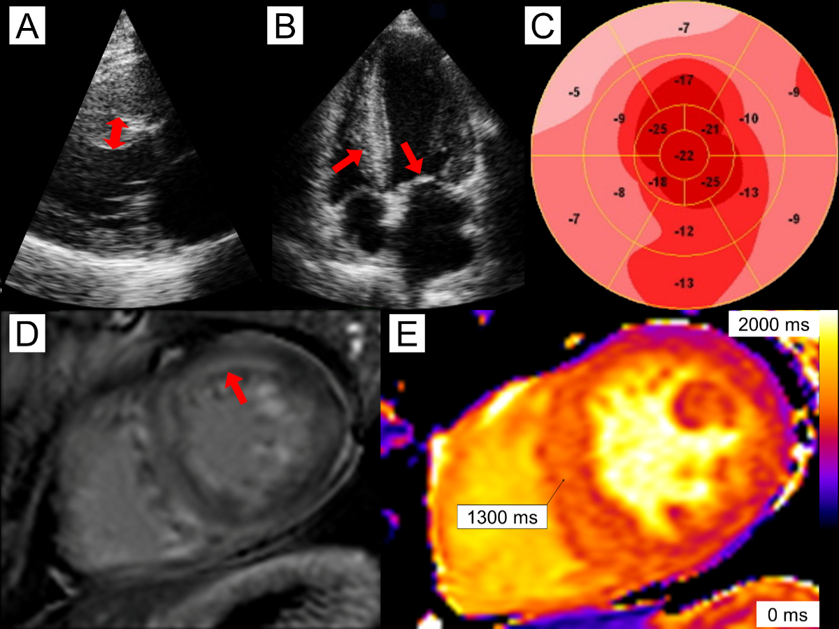 Figure 1A 56-year-old male with cardiac AL (light chain) amyloidosis. Echocardiography reveals mild asymmetric left ventricular (LV) hypertrophy with septal wall thickness of 14 mm (panel A, double-headed arrow) as well as thickening of the right ventricle (RV) and mitral valve (panel B, arrows). There is reduced global longitudinal strain of –14.3% and relative apical sparing (panel C). Cardiac magnetic resonance imaging reveals diffuse, predominantly subendocardial late gadolinium enhancement (panel D, arrow). Native T1 times were elevated in the septum, measuring 1300 ms (panel E).