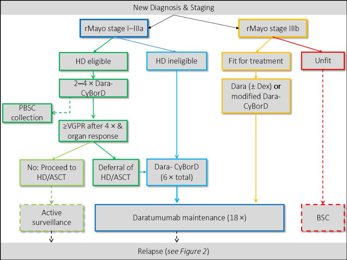 For patients with rMayo Stage I–IIIa, as represented in the ANDROMEDA trial [17], first-line treatment generally includes induction with Dara-CyBorD (Daratumumab, Cyclophosphamide, Bortezomib and Dexamethasone). The potential benefit of upfront high-dose therapy / autologous stem cell transplantation has not been clearly established yet. The only RCT on this particular matter did not show a survival benefit but was criticised for its unrepresentative inclusion criteria [18]. The ongoing uncertainty has led to country-specific differences in the indication for performing high-dose therapy / autologous stem cell transplantation. In general, given the rarity of the disease and the many unknown variables, if available, treatment in clinical trials should be considered. In Switzerland, treatment with Dara-CyBorD requires prior health insurance approval, which is generally granted. The SAN has agreed on the following recommendations regarding first-line therapy (figure 1):