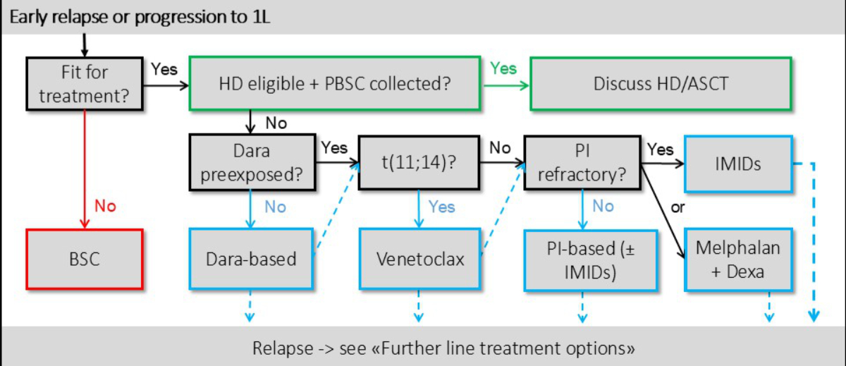 If relapse occurs after the current standard-of-care, Dara-CyBorD or similar protocols including an anti-CD38-Ab and proteasome inhibitor, there is no universal standard for further-line therapy and the available evidence is often limited to registry data and small case series. Therefore, the following options are Grade B or C recommendations and are based on expert consensus within the SAN.
