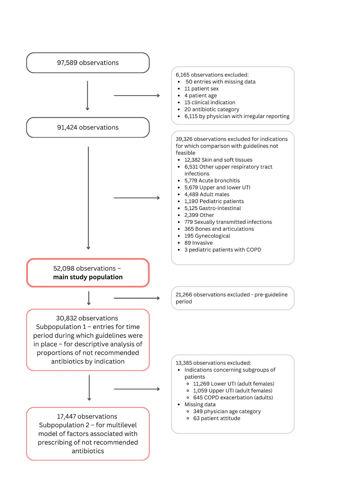 We identified specific indications from the Sentinella dataset where comparisons with national guidelines were feasible. This selection was based on assessing the compatibility of indications, patient age and sex categories. The included indications were pharyngitis, sinusitis, otitis media, chronic obstructive pulmonary disease (COPD) exacerbation (limited to adults), pneumonia, and upper and lower urinary tract infections (limited to adult female patients). The Sentinella dataset includes several indications that were excluded from our study due to the absence of corresponding guidelines. Entries from physicians reporting irregularly (fewer than 39 weeks per year) were excluded, in accordance with the methodology used by the Swiss Federal Office of Public Health to ensure consistency with national surveillance reports.