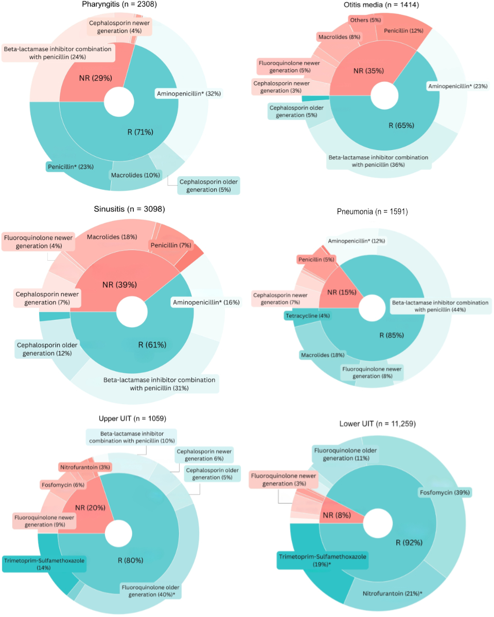 Figure 3Antibiotics by recommendation level by clinical indication in adults. Only indications with more than 1000 observations are displayed. Analyses performed for the period during which guidelines were in place. * First-line treatments according to the guidelines by the Swiss Society of Infectious Diseases (SSI). Antibiotic categories are annotated only if they account for more than 3% of all prescriptions per indication. Entries with missing data (n = 50), specifically related to patient sex, age, clinical indications and antibiotic categories, were excluded from all analyses at the first step of the flowchart, without selective exclusion from specific figures. NR: not recommended; R: recommended.