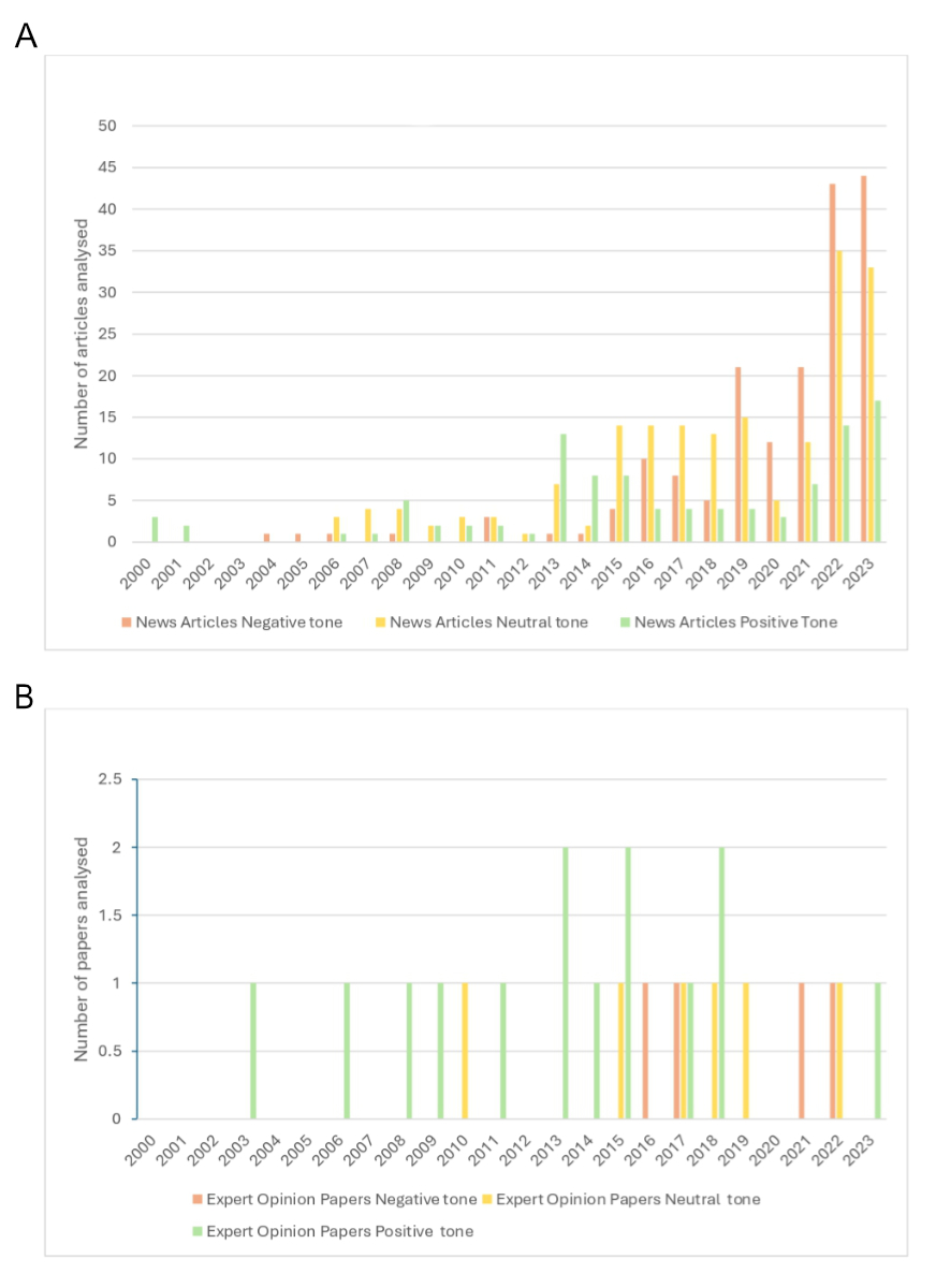 Figure 2The graphs illustrate the tone of news articles (A) and expert opinion papers (B) – negative (red), neutral (yellow) and positive (green) – alongside the total number of articles analysed each year. Publications coded red predominantly conveyed negative messages, yellow reflected a neutral and balanced approach and green emphasised the positive societal impact of data-sharing initiatives.