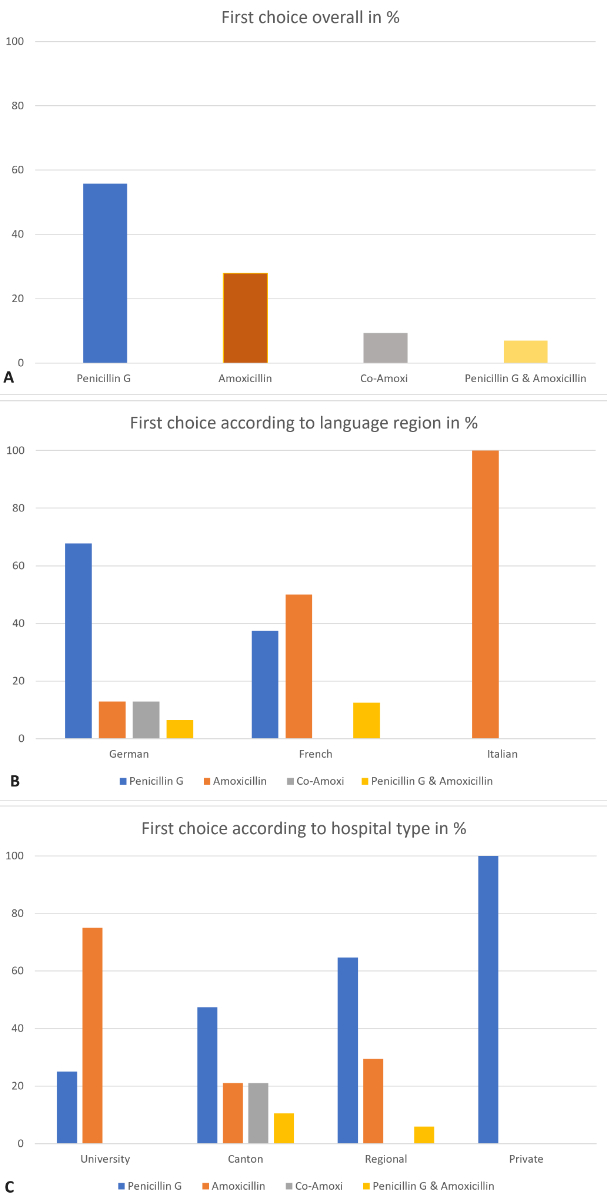 Figure 1Choice of antibiotics: (A) First-choice antibiotics in Switzerland overall; (B) First-choice antibiotics by language region; (C) First-choice antibiotics by hospital type. Data is expressed as percentages.