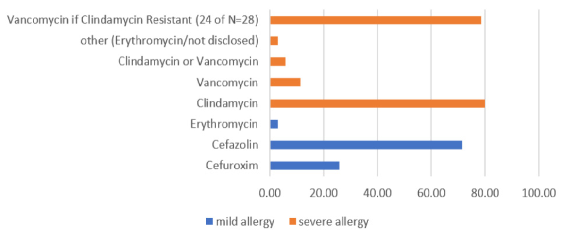 Figure 2Second-choice antibiotics with allergy differentiation (n = 35). Differentiation is expressed as percentages.