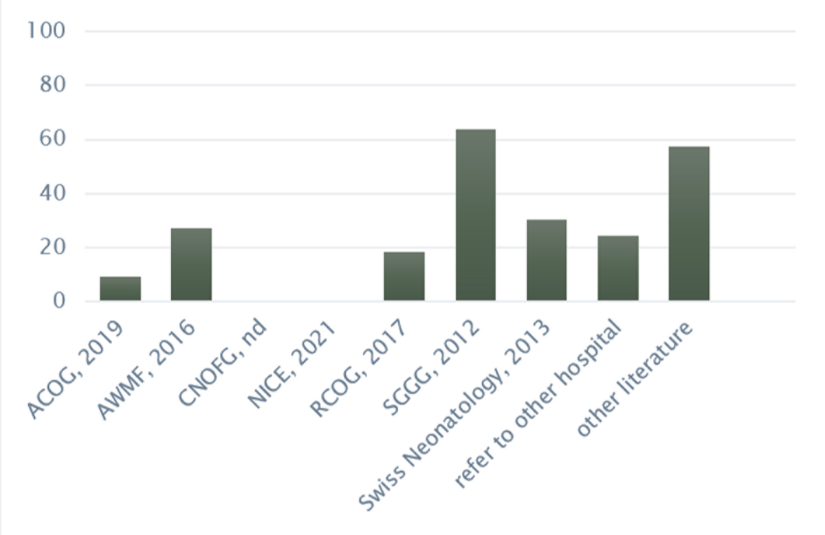 Of 43 protocols, 23% (n = 10) did not state any references. Of the remaining 33, the majority cited guidelines of national or international professional societies, with SGGG Expert Letter No. 19 [7] being the most frequently cited (64%, n = 21) (see figure 3). This was followed by the guidelines of the Swiss Society of Neonatology in collaboration with the Paediatric Infectious Disease Group Switzerland [8] (30%, n = 10) and AWMF guidelines [25] (27%, n = 9). Over a half (58%, n = 19) cited additional literature (systematic reviews, scientific articles, etc).