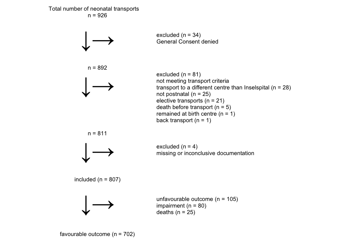 From January 2019 to December 2022, a total of 926 patients were transported by the neonatal transport service of the Bern University Children’s Hospital. Of these, 807 met the inclusion criteria. These patients were transferred from 19 different referral hospitals to Bern University Children’s Hospital. Patient selection is shown in figure 1. Patient and transport characteristics are summarised in tables S1–S3 in the appendix.