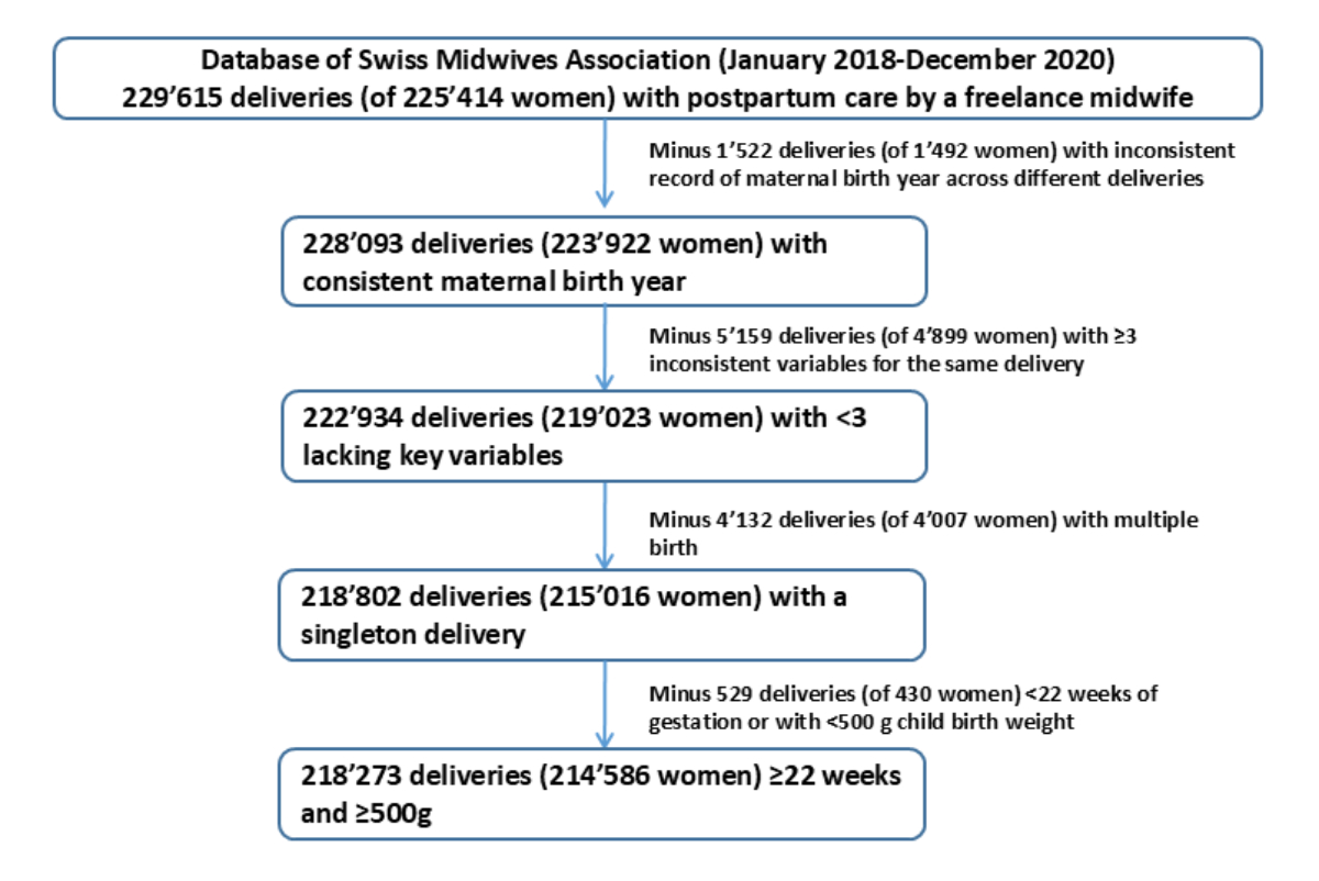We included all births between 2018 and 2020 to women with at least one postpartum-related outpatient visit by a midwife. We excluded births of women whose birth year was inconsistently recorded or if ≥3 key variables (i.e. birth mode, birth year of the mother, gravidity, parity, multiple birth status, gestational age at birth, birthweight of the child, birth place, or all three Apgar scores i.e. at 1, 5 and 10 minutes]) were lacking. We also excluded multiple births and miscarriages (births at gestational week <22 or birthweight <500 g). Midwives in Switzerland can choose between six different electronic billing systems; one of these does not reliably capture Apgar scores so we excluded all births billed via this system for analyses of Apgar scores (n = 15,631).