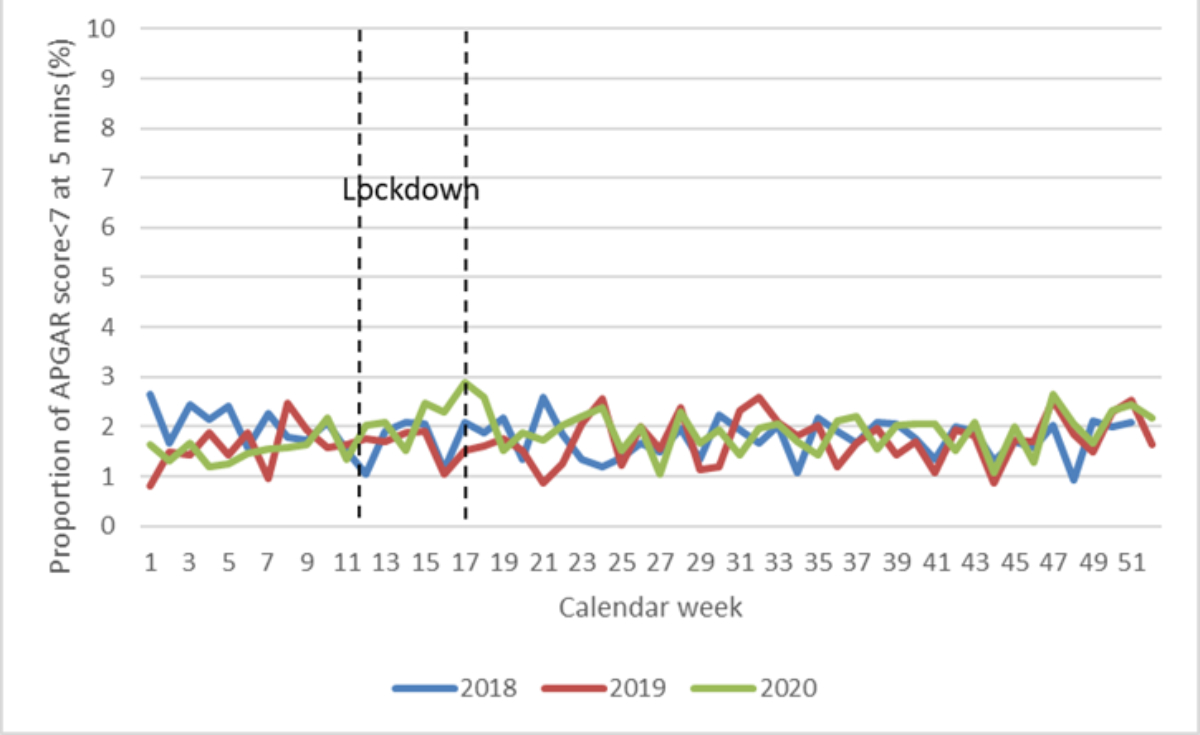 Figure 5Weekly proportion of newborns with a moderate/low Apgar score (<7) at 5 minutes between 2018 and 2020 in Switzerland.
