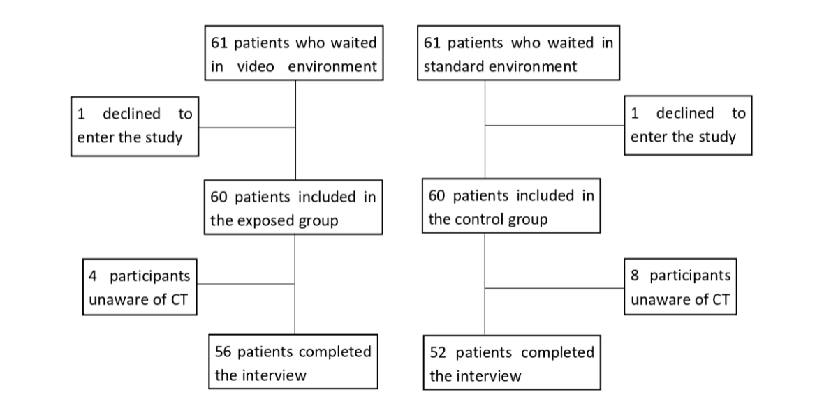 The exposed group was recruited on days on which the video was displayed and the control group on days on which it was not displayed. To ensure adequate video exposure, participants of the exposed group had to have been sitting in the waiting room for at least 30 minutes for the intervention to be considered valid. Participants were not explicitly informed of the video’s presence.
