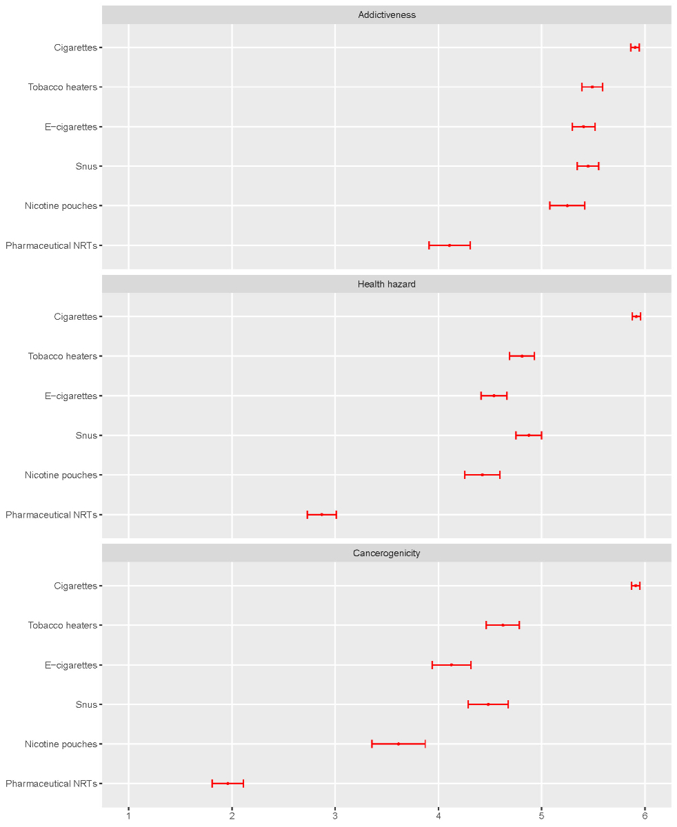 Figure 4Perceived addictiveness, health hazard, and carcinogenicity of the different nicotine-based products and nicotine replacement therapies (NRT) (n = 259). 6-point Likert scale: 1: Not at all; 6: Totally. The mean value is displayed with 95% confidence intervals. Missing values for each question are as follows: addictiveness: 14 for cigarettes, 61 for tobacco heating systems, 28 for e-cigarettes, 57 for snus, 118 for nicotine pouches, and 0 for pharmaceutical nicotine replacement therapies; health hazard: 6 for cigarettes, 53 for tobacco heating systems, 21 for e-cigarettes, 49 for snus, 83 for nicotine pouches, and 11 for pharmaceutical nicotine replacement therapies; carcinogenicity: 12 for cigarettes, 83 for tobacco heating systems, 69 for e-cigarettes, 83 for snus, 106 for nicotine pouches, and 34 for pharmaceutical nicotine replacement therapies.