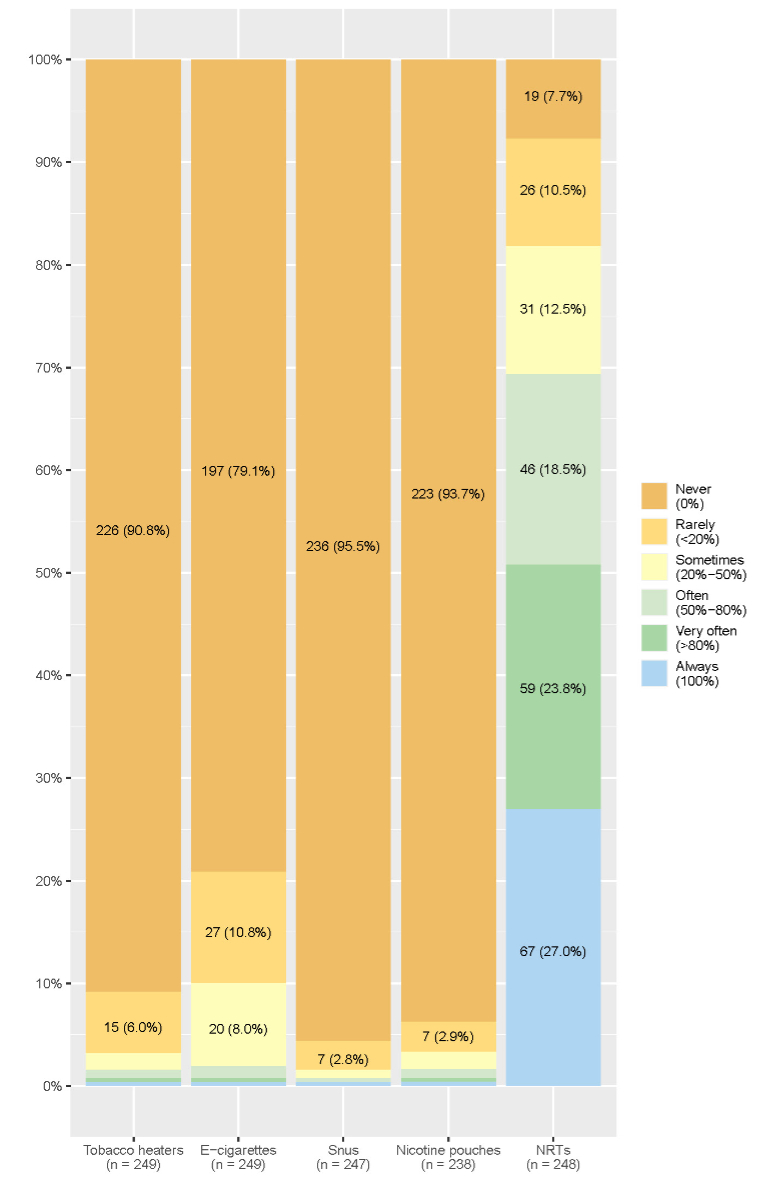 Figure 5Pharmacists’ self-reported frequency of recommendation of alternative nicotine delivery systems and nicotine replacement therapies as smoking cessation aids [n, (%)]. Frequencies with percentages below 2.5% are not displayed. There are 11 missing values for nicotine replacement therapies, 10 for tobacco heating systems, 10 for e-cigarettes, 21 for nicotine pouches, and 12 for snus.