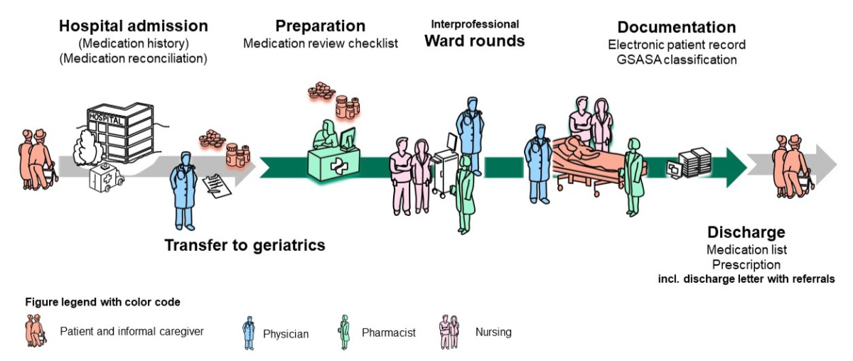 Older adult populations aged 75 or older are a particular challenge to daily medical care because of, among other things, the age-related physiological changes,characterised by impairment in the function of the many regulatory processes. Under the physiological stress that can occur in acute health conditions, homeostasis may not be maintained, leading to hospitalisation [1]. Medication-induced adverse effects may occur due to older adults’ altered pharmacokinetics and pharmacodynamics. It is well documented that they are often prescribed medications that, though safe for younger patients, are potentially inappropriate considering their age [2, 3]. Furthermore, older adult patients are often multimorbid, polymedicated, frail and cognitively impaired – all risk factors for medication-related problems (MRPs), which encompass (preventable) medication errors and adverse drug reactions. When admitted into inpatient care, interfaces between institutions and healthcare professionals pose the additional risk of information gaps that could lead to medication discrepancies and potentially hazardous treatment errors [4]. Data from a 2019 study in Switzerland by Giannini et al. found, through medication reconciliation, at least one discrepancy with every patient, with an average of three medications omitted. Indeed, they determined that 21% of the discrepancies were clinically relevant, and 19% of those were significant, i.e. had the potential to cause a mild-to-moderate adverse effect [5].