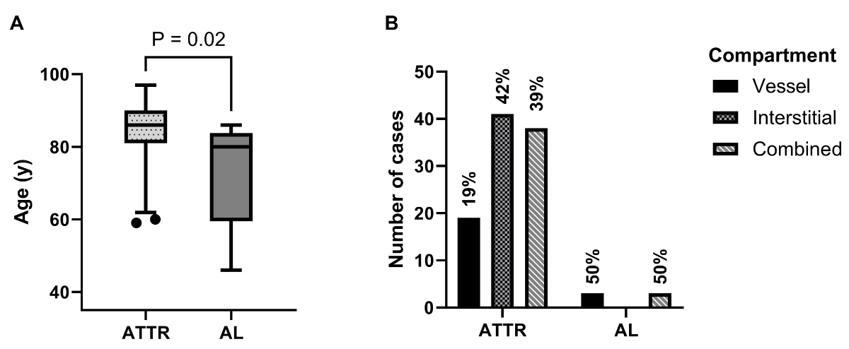 Figure 1(A): Age distribution of cases classified according to amyloidosis type; whiskers at 2.5 and 97.5 percentiles (p-value calculated with Mann-Whitney U test). (B): Cases classified according to the type and distribution of myocardial amyloid deposits. Percentages of cases by type. AL: amyloid light chain-cardiac amyloidosis; ATTR: amyloid transthyretin-cardiac amyloidosis.