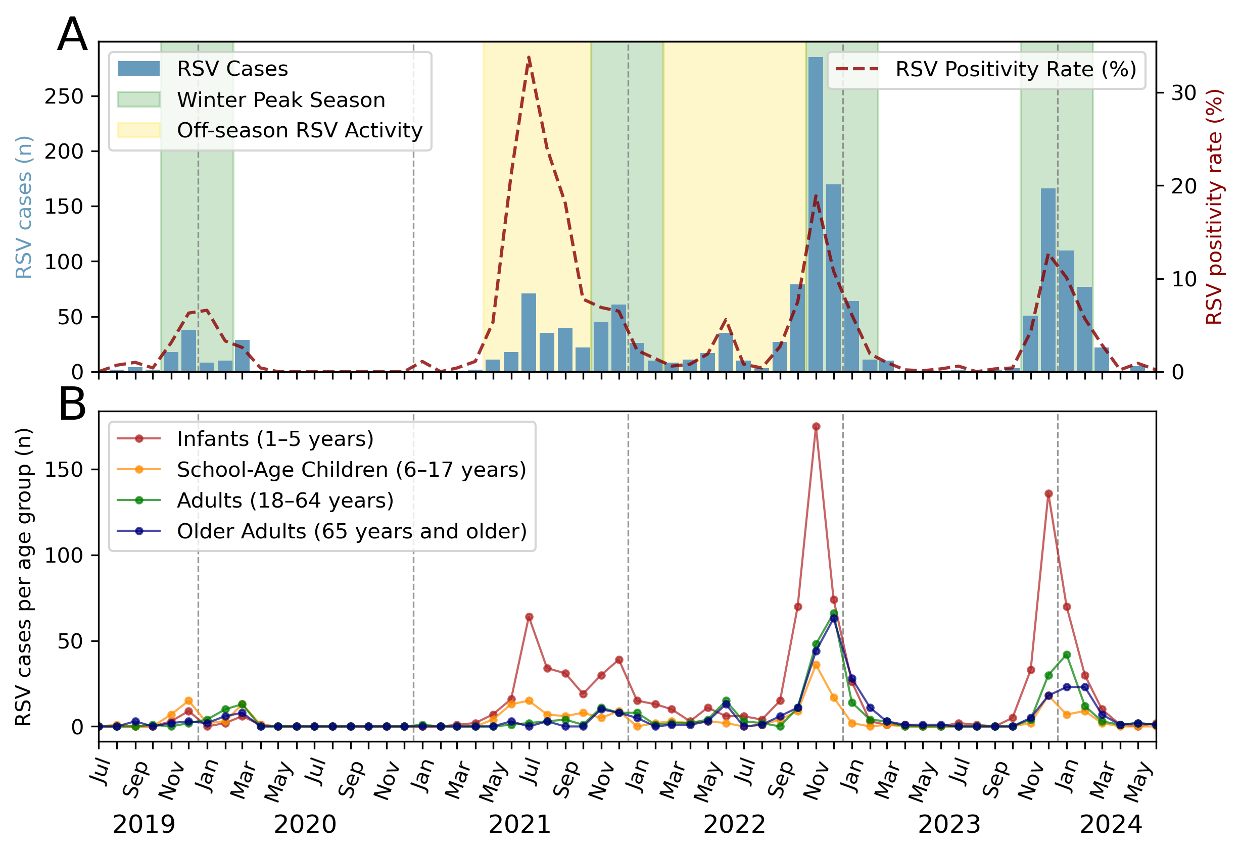 First, we assessed the seasonality and peak activity of RSV during the study period. In 2019, prior to the COVID-19 pandemic, the number of RSV infections in our catchment area increased in October and subsided by February 2020, consistent with seasonal patterns observed before the pandemic [3]. The implementation of non-pharmaceutical interventions to reduce the spread of SARS-CoV-2 in 2020 and 2021, including travel restrictions, social distancing, mask mandates, and school and business closures, disrupted this regularity. Notably, during the 2020/21 season, RSV activity was minimal, with no significant epidemic observed. However, an atypical early surge occurred in 2021. Cases began to rise in May, peaking in July, and persisting until January 2022. Subsequent post-pandemic 2022/23 and 2023/24 seasons indicated a return to pre-pandemic seasonality, with activity commencing in late summer, peaking in November and declining by January (figure 1A).