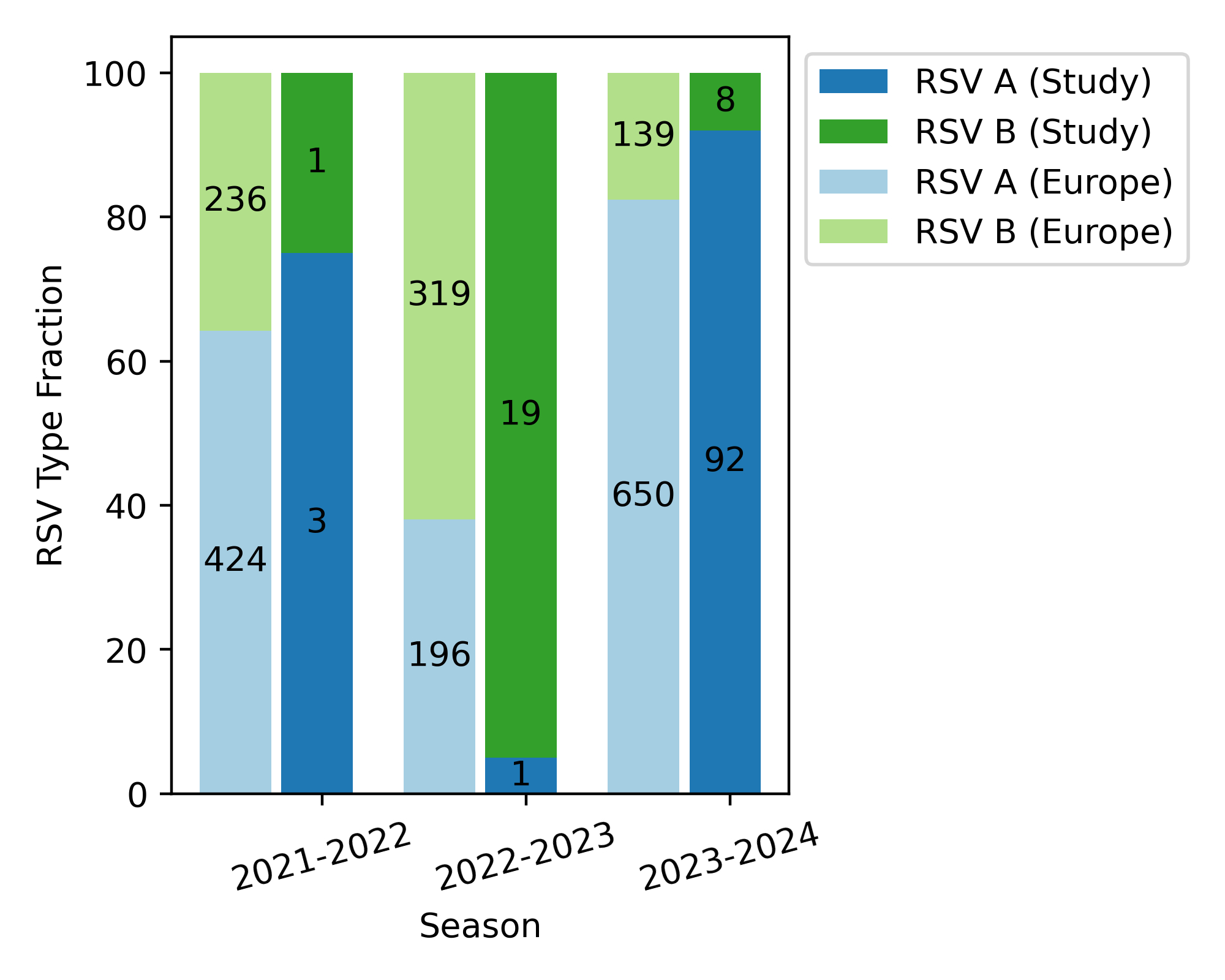 Figure 2Annual distribution of RSV A and RSV B subtypes in Switzerland and Europe over the 2021/22, 2022/23 and 2023/24 seasons. Numbers inside the bars display actual numbers of respiratory syncytial virus (RSV) subtype cases, while heights correspond to fractions. Stacked bars to the left show same-season RSV subtype distributions in European samples available in the NCBI virus database.