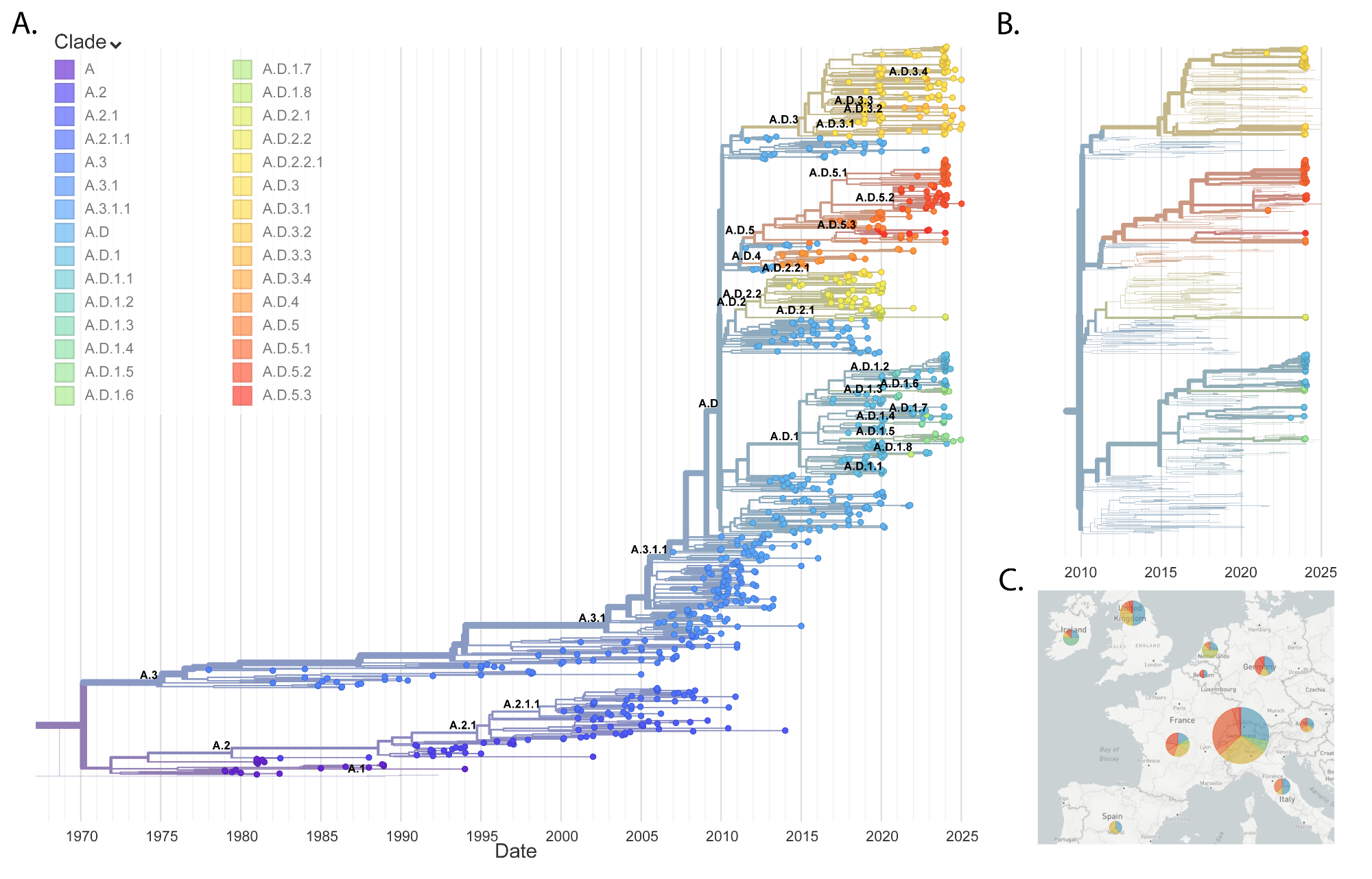 Figure 3RSV A phylogeny. (A) Global phylogenetic tree of RSV A sequences. (B) RSV A phylogenetic tree focusing on the last two years of European data. Bold leaves indicate sequences generated in this study. (C) Geographic distribution of RSV A clades in Europe over the last two seasons.
