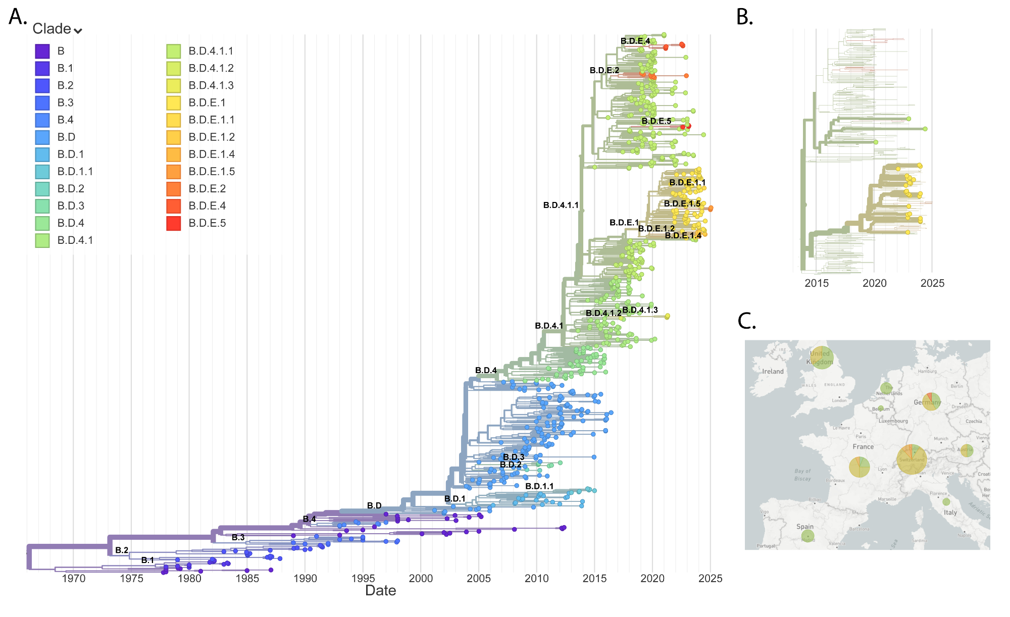 Figure 4RSV B phylogeny. (A) Global phylogenetic tree of RSV B sequences. (B) RSV B phylogenetic tree focusing on the last two years of European data. Bold leaves indicate sequences generated in this study. (C) Geographic distribution of RSV B clades in Europe during the last two seasons.