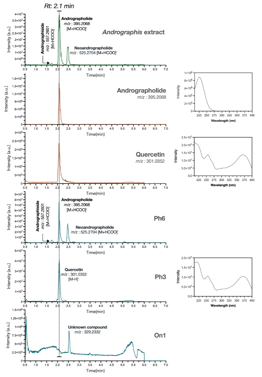 Figure 1UHPLC-PDA-HRMS chromatograms, comparing standardised extract of Andrographis paniculata (green trace) vs marketed herbal products (blue traces) and pure standards (orange traces). Andrographolide and quercetin were found to elute at the same retention time (rt: 2.1 min) but were unequivocally discriminated after their exact mass. Various herbal products differed in chemical content: Ph6 resembled A. paniculata extract, Ph3 contained andrographolide with a dominant quercetin signal and On1 lacked characteristic A. paniculata signals. HRMS: high-resolution mass spectrometry; On: online; PDA: photo diode array; Ph: pharmacy; UHPLC: ultra-high-performance liquid chromatography.