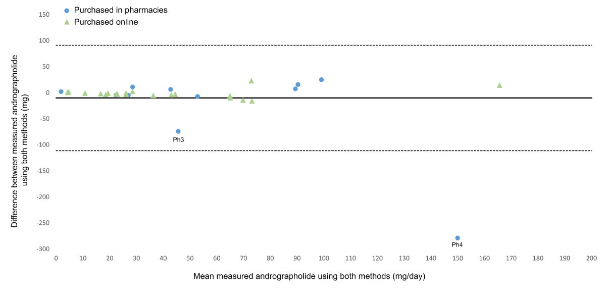 Figure 2Bland-Altman plot of measured andrographolide using UHPLC-MS versus UHPLC-UV expressed in daily dose for each product purchased in a pharmacy or online. The solid line represents the mean difference and the dashed lines represent the limits of agreement (mean difference ± 1.96 standard deviations). MS: mass spectrometry; UHPLC: ultra-high-performance liquid chromatography; UV: ultraviolet.