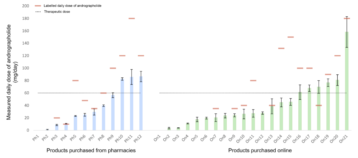 For each solid A. paniculata product with complete labelling, we calculated the labelled daily dose by multiplying the single serving dose by the maximum daily servings (dosage) given on the labelling. We calculated the labelled andrographolide daily dose based on its proportion in the extract. For instance, product Ph10’s labelling indicated 400 mg of A. paniculata per capsule with 10% andrographolide; with three capsules daily, the labelled doses were 1200 mg and 120 mg, respectively. Similarly, we calculated the measured daily dose of andrographolide for each sample using the average of the triplicate values for both ultraviolet and mass spectrometry methods. For comparison of measured versus labelled daily dose of andrographolide, and versus the daily therapeutic dose, we considered results obtained using UHPLC-UV. However, mass spectrometry results were prioritised when there were substantial differences between these two methods. HPLC-UV is insufficient when it comes to analysing complex matrices such as those based on several plant extracts.