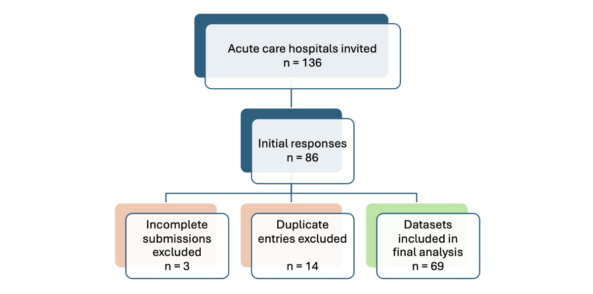 Hospitals completed the questionnaire on a secure web-based platform (SurveyMonkey®, San Mateo, CA, USA). Only one response set per hospital was accepted. Survey responses were exported and cleaned to remove incomplete or duplicate entries. Descriptive statistics (frequencies and percentages) were used to summarise the data. A total of 86 responses were recorded. After excluding 14 duplicate entries (when more than one survey was saved for the same institution because of technical issues, only one entry was retained per hospital) and 3 incomplete responses, a total of 69 datasets were included in the final analysis (shown in the flow diagram in figure 1).
