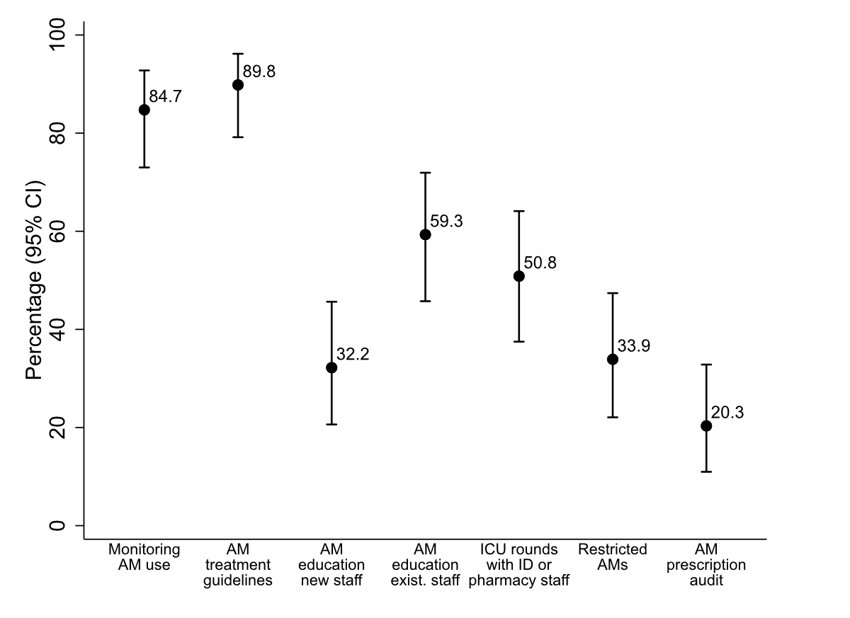 Figure 3 Proportion of hospitals reporting selected antimicrobial stewardship activities among those with at least one implemented stewardship activity (n = 59): monitoring antimicrobial use, antimicrobial treatment guideline implementation, staff education (new vs existing staff), infectious diseases physician or pharmacist involvement in ICU rounds, antimicrobial prescribing restrictions, and prescription audits. Error bars represent 95% confidence intervals. Abbreviation: AM = antimicrobial.