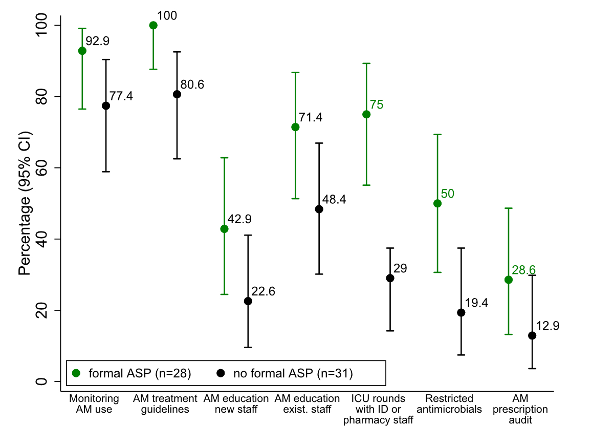Figure 4 Proportion of hospitals reporting selected antimicrobial stewardship activities among those with at least one implemented stewardship activity (n = 59), stratified by the presence or absence of a formal antimicrobial stewardship programme: monitoring antimicrobial use, antimicrobial treatment guideline implementation, staff education (new vs existing staff), infectious disease physician or pharmacist involvement in ICU rounds, antimicrobial prescribing restrictions, and prescription audits. Differences were significant for availability of treatment guidelines,ICU rounds with ID or pharmacy staff, and antimicrobial restrictions (P-values of 0.025, <0.001, and 0.026, respectively; Fisher’s Exact test). Error bars represent 95% confidence intervals. Abbreviations: AM = antimicrobial; ASP = antimicrobial stewardship programme.