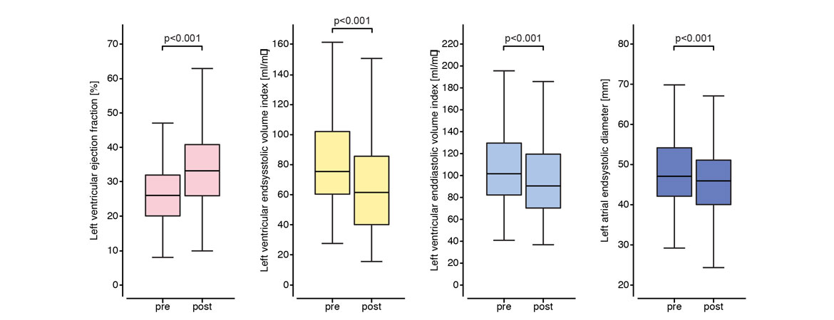 A total of 418 patients with a median age of 66 years at the time of CRT implantation (78% male) were enrolled. Serious peri-interventional complications (from the time of implantation up to 14 days thereafter) were rare and included systemic infections in 2.4%, pneumothorax in 3.3% and haematoma requiring revision in 2.2% of cases. Overall, the Kaplan-Meier estimate for 5-year freedom from the composite endpoint (hospitalisation for heart failure or mortality) was 55.8%; the Kaplan-Meier estimate for 5-year freedom from mortality was 64.1%. CRT was associated with a significant symptomatic improvement and left ventricular reverse remodelling.