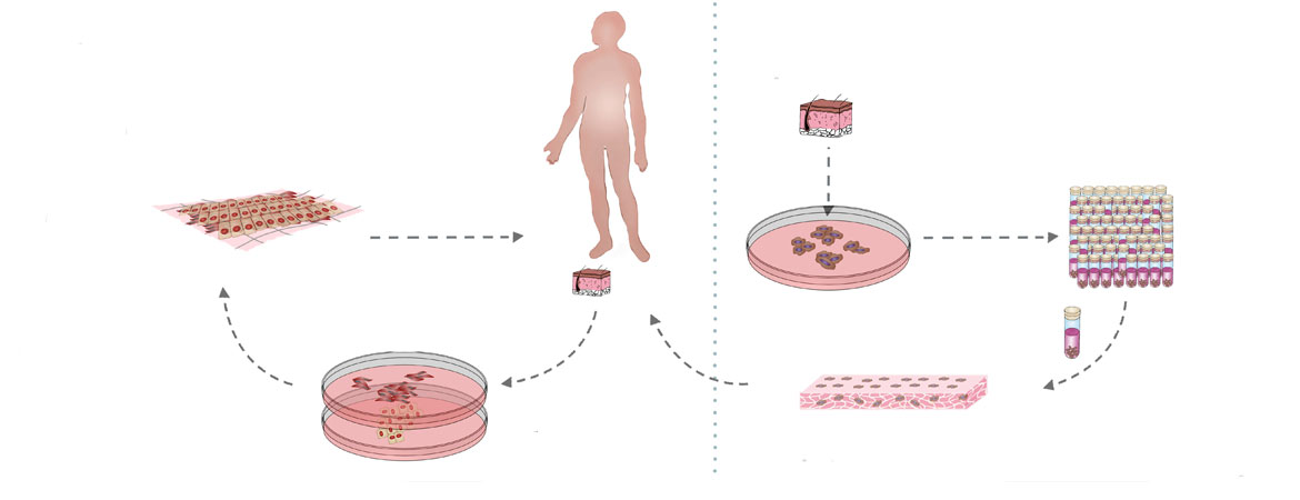 The earliest attempts at cell therapy can be attributed to Charles-Edward Brown-Séquard (1817–1894), who sought to treat senescence and aging by injecting animal gonad shreds into his contemporaries, a practice that was widespread in late 19th century. Since then, advances in science have enabled the development of biological substitutes to restore the function of various tissues. Skin was one of the first tissues to be regenerated. For severe burns, patient survival depends on the restoration of skin function as a barrier against pathogens and control of body temperature and fluid loss. We aim here to overview the different cell therapy techniques implemented at the University Hospital of Lausanne (CHUV), one of the two Swiss national centres of highly specialised medicine for burn care. In particular, we will describe the specific indications for each of the different therapies as well as future perspectives.